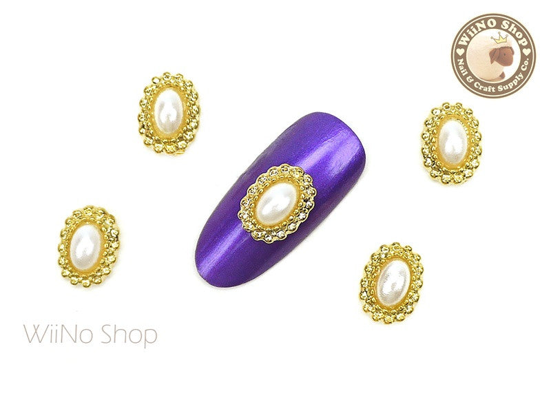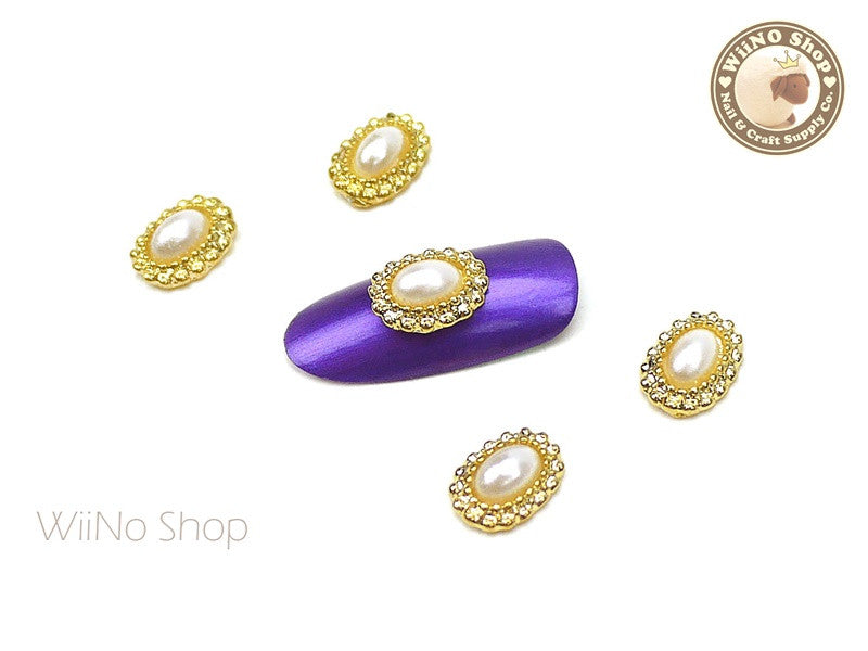 Gold Oval Pearl Beads Frame Nail Metal Charm - 2 pcs